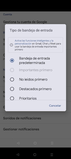 - Modificar el orden de los correos de la bandeja de entrada: si quieres modificar los mensajes que te aparecen primero en bandeja de entrada solo tienes que ir a "ajustes", elegir la cuenta en la que deseas cambiar el orden de los correos, darle a "Tipo de bandeja de entrada" y seleccionar el tipo de bandeja de entrada que deseas (predeterminada, no leídos primero, destacados primero o prioritarios).